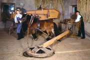 Ob našem obisku je ravno poprijel za harmoniko in pospremil skupino obiskovalcev v zbirko. Hip za tem je vrtel cep, mlatil žito, rezal slamo in nato pripovedoval in razlagal, kako so njega dni ...